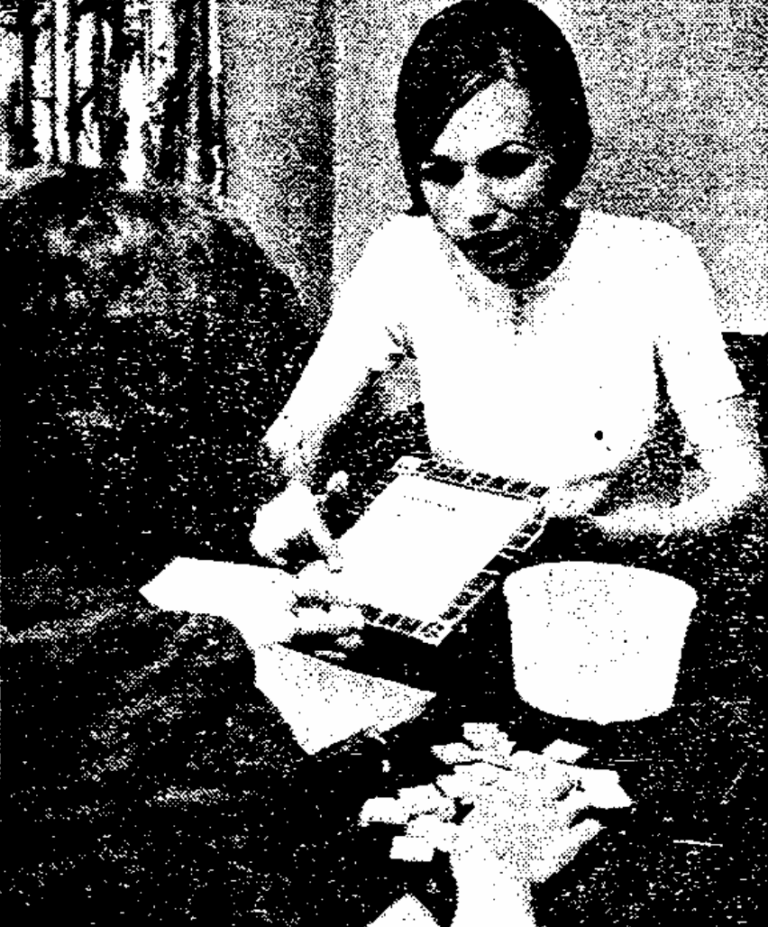 Mrs. Louis Orkin shows a women with multiple sclerosis how a tile is placed in a trivet, as part of their crafts session.