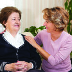 volunteer with senior woman sitting outside